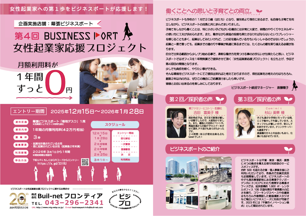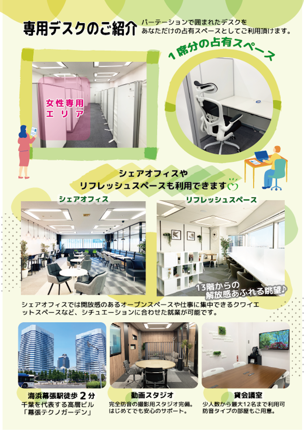 - 提供内容: 幕張ビジネスポート女性専用エリア8席の中の「専用デスク」1席(会員制シェアオフィス利用も含む)