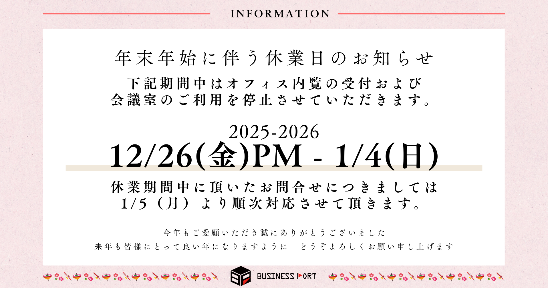 【年末年始休業に伴う内覧および会議室利用停止のお知らせ】